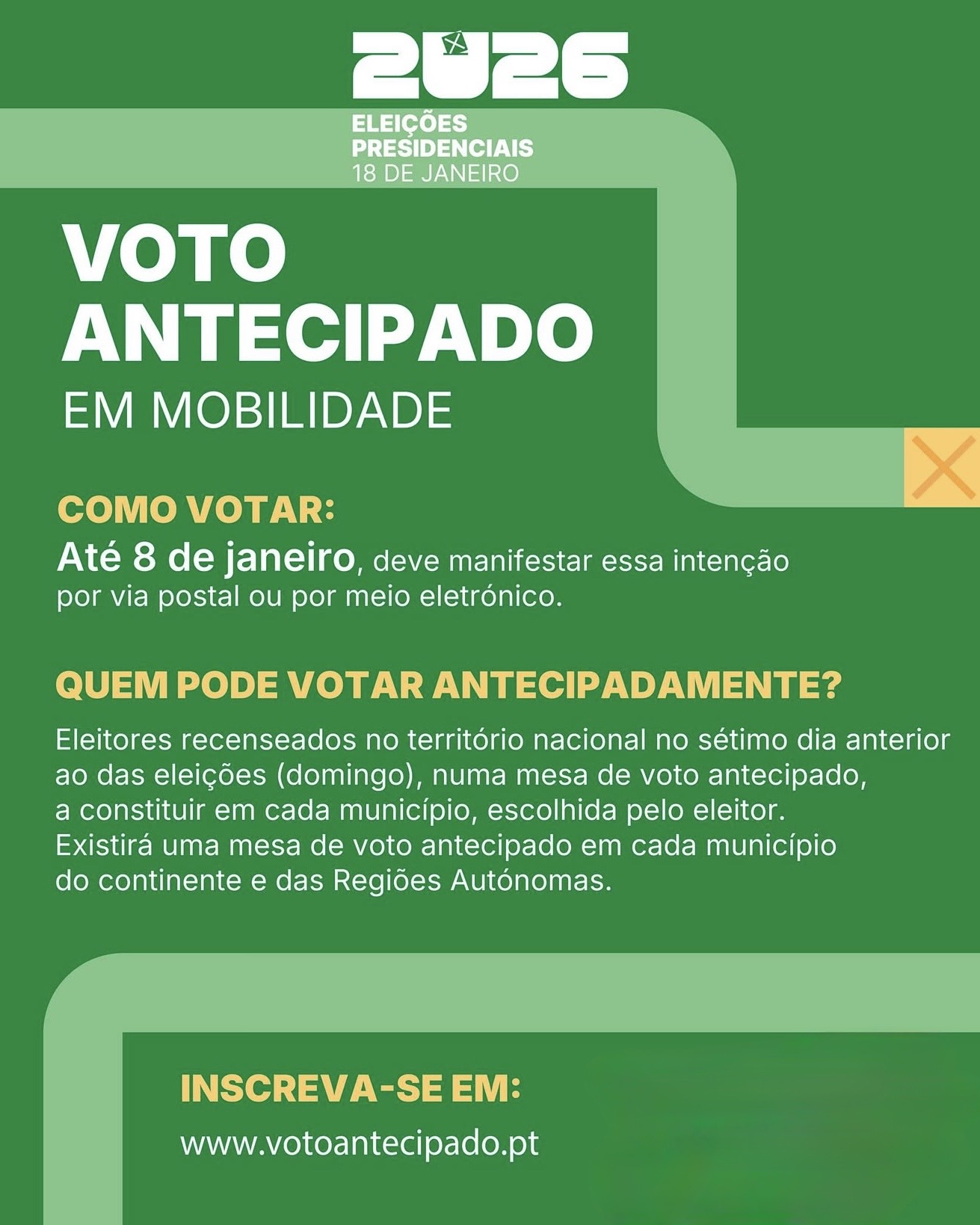 Informamos que estão abertas as inscrições para o Voto Antecipado em Mobilidade para as Eleições Presidenciais de 2026. Se no dia 18 de janeiro não puder deslocar-se à sua mesa de voto habitual, não deixe que a distância o impeça de exercer o seu direito.