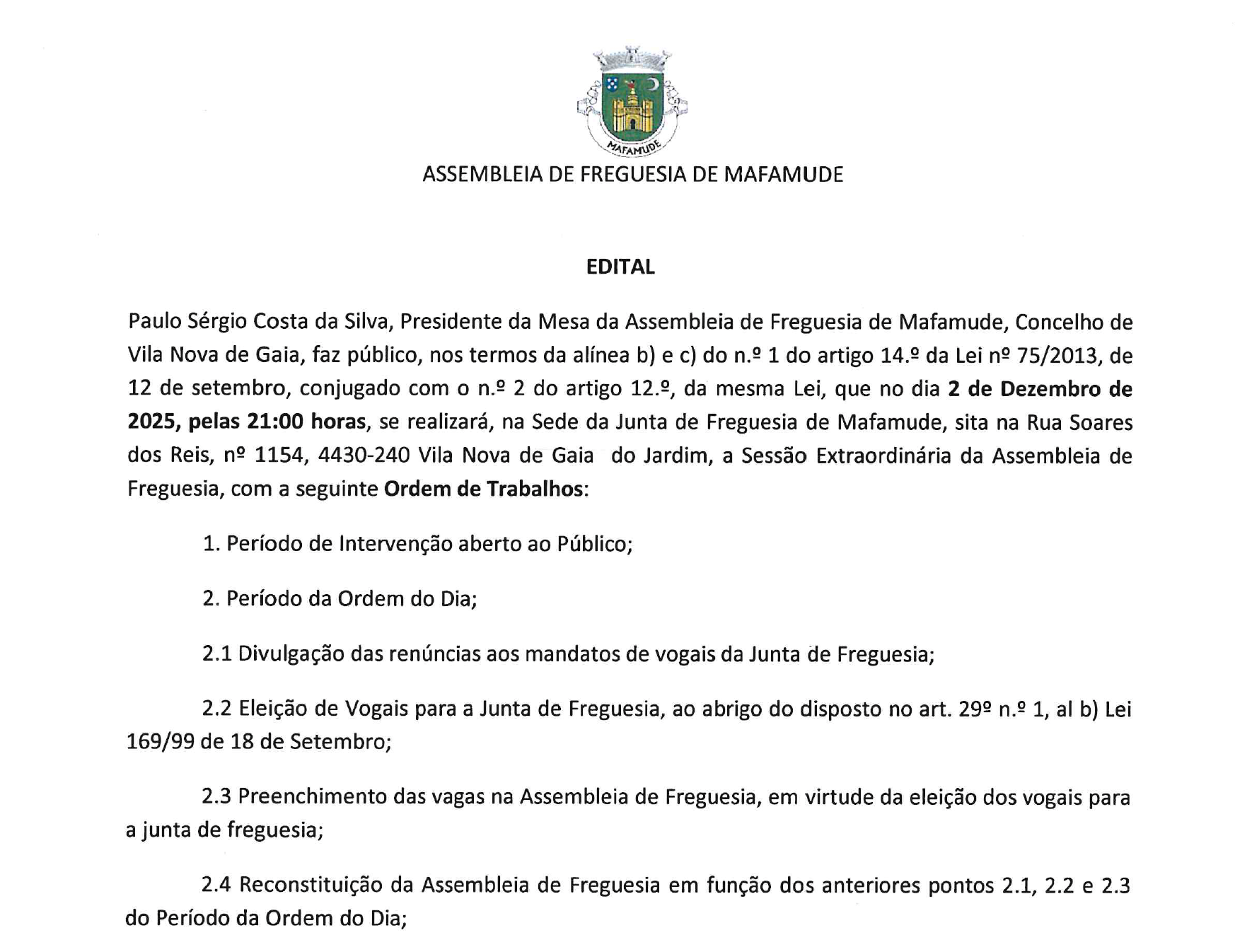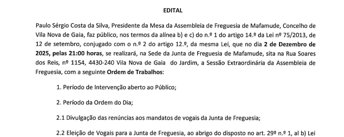 Edital – Sessão Extraordinária da Assembleia de Freguesia – 02/12/2025